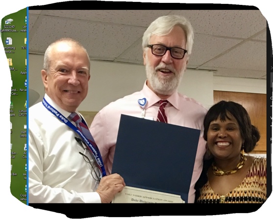 Receiving 5-year certificate for Pastoral Care clinical volunteer hours at Duke Emergency Department 2019 .